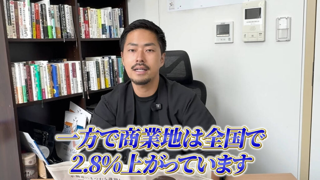 全国平均の地価上昇率を見ると、住宅地が1%の上昇にとどまっているのに対し、商業地は2.8%と約3倍近い伸びを記録しています。